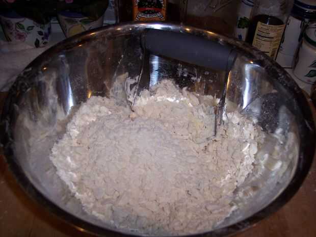 Usando un cortador de pastelería, cortar la mantequilla y la harina usando el mismo movimiento como si fuera al puré de patatas. Asegúrese de pisar fuerte en el tazón de fuente y combinar toda la harina. Lo que quieres es dividir la mantequilla en trozos del tamaño de guisante.