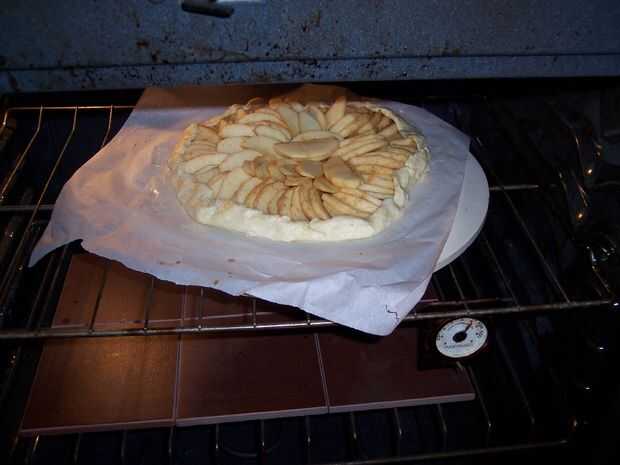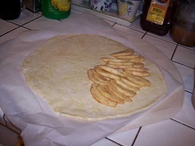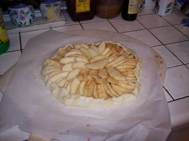 Para mi tarta de manzana, he superpuesto las manzanas en círculos concéntricos y un pequeño de 1" borde izquierdo. Luego fue alrededor del borde y voltea y agrupados juntos. Trate de no perder demasiado tiempo con el diseño que quieras mantener la masa fría. Mina caliente y agujeros a la izquierda de estirar demasiado.
