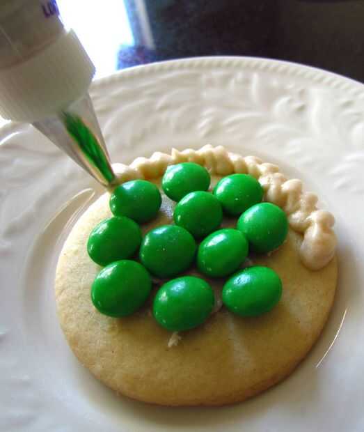 Elige tu sabor de pastel y seleccionar el M & M color en consecuencia. Por ejemplo, arándano es azul o rojo sería cereza. En este caso, la empanada era manzana (verde M & Ms). El centro de la galleta con los M & Ms y luego tubo en algún betún marrón "corteza" (con punta de Wilton #102) alrededor de los bordes de la línea.