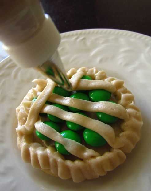 Ahora, el cruzado que va en la parte superior de la empanada de la pipa. Utilizando la misma punta #102 y betún marrón, tubo rayas en una sola dirección, con un espacio en el medio de cada uno y luego repetir va la otra dirección. Alternativamente, si usted está haciendo un pastel que generalmente ha crema batida en la parte superior (como el plátano), use el blanco glaseado le reservados antes para tubería en las bombas de crema chantilly (con punta de Wilton #18).
