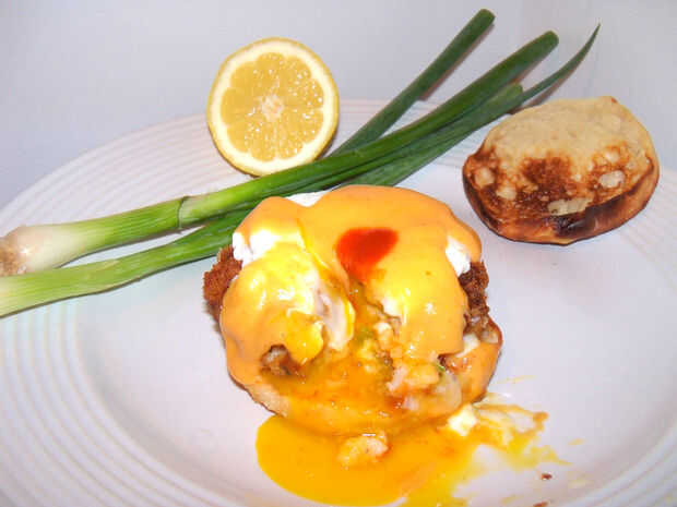 Su panecillo inglés tostado, huevo escalfado, torta de camarón y salsa holandesa y las combina. Agregue limón y Sriracha. Comer, servir y disfrutar! Sé que hice.