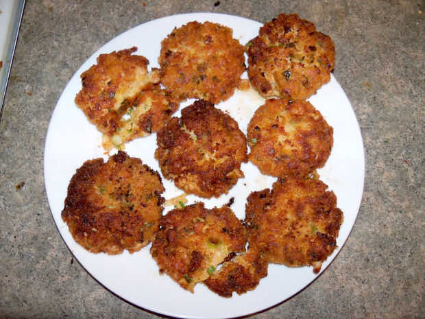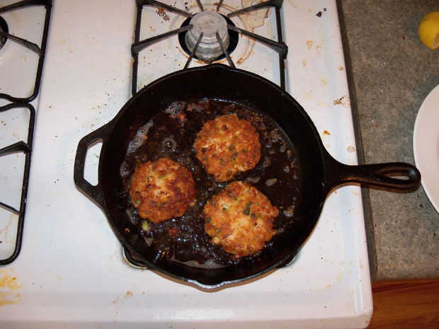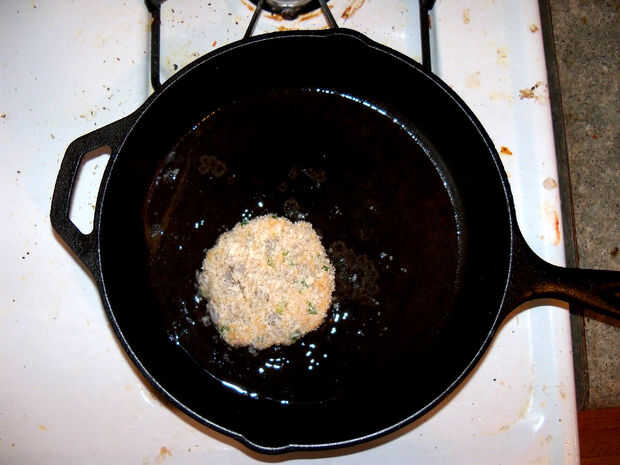 2. Freír tortas de camarón a un color dorado en ambos lados, o una temperatura interna de ~ 140 grados. (Yo usé un termómetro de carne Lea instantánea).