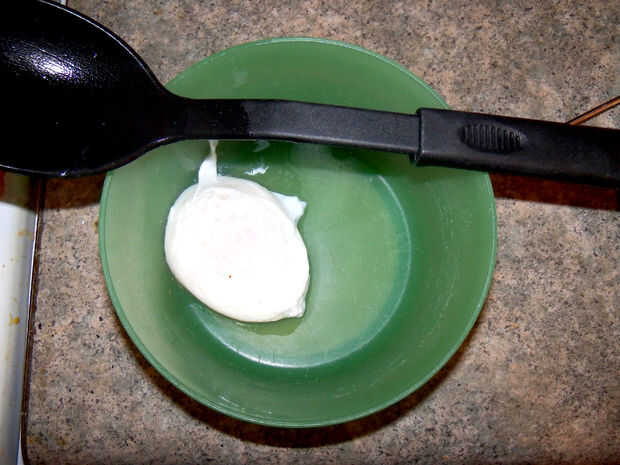 5. Añadir huevo en agua, esperar aproximadamente 3-4 minutos o así. Quitar.