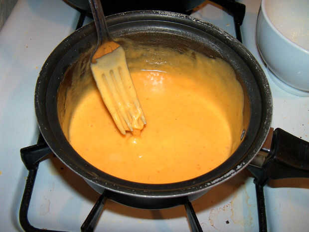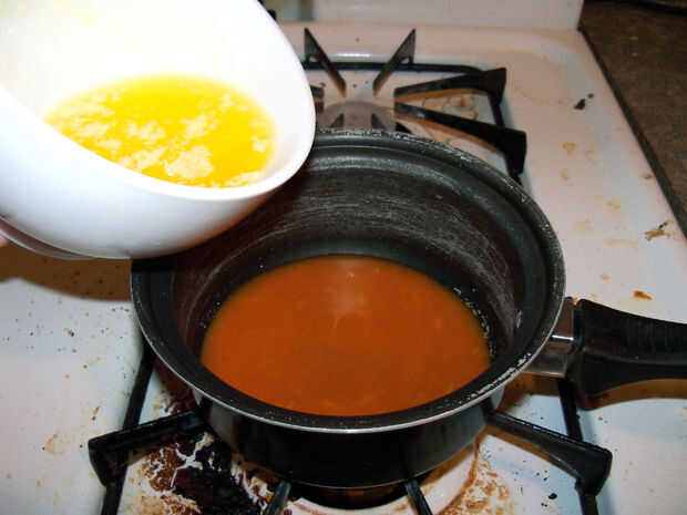 Batir enérgicamente la mantequilla derretida en la mezcla de salsa con huevo-limón-caliente, teniendo cuidado de añadir la mantequilla muy lentamente. Cuando la mantequilla se ha agregado, encender la calefacción por debajo de la cacerola a fuego lento bajo, continuar a batir. El Sriracha Hollandaise estará lista cuando empiece a espesar y se adhieren a su instrumento whisking, con la consistencia de la salsa de queso.