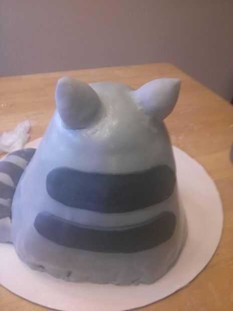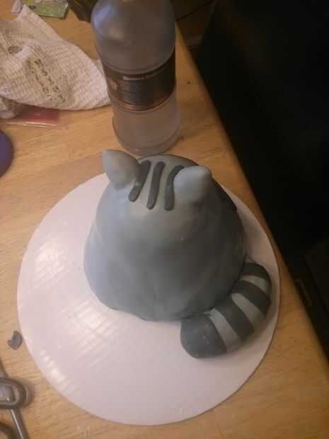 Pusheen tiene franjas grises oscuras en su cuerpo. He añadido colorante extra negro a mi izquierda sobre fondant coloreado cuerpo para lograr el color de la raya. Yo rodé el fondant fuera delgada y cortar dos bandas grandes para la espalda, cuatro medio de su cola y tres pequeños de su cabeza. Puede utilizar un pincel limpio para cepillo en el agua que se fijan bandas de Pusheen para su cuerpo.