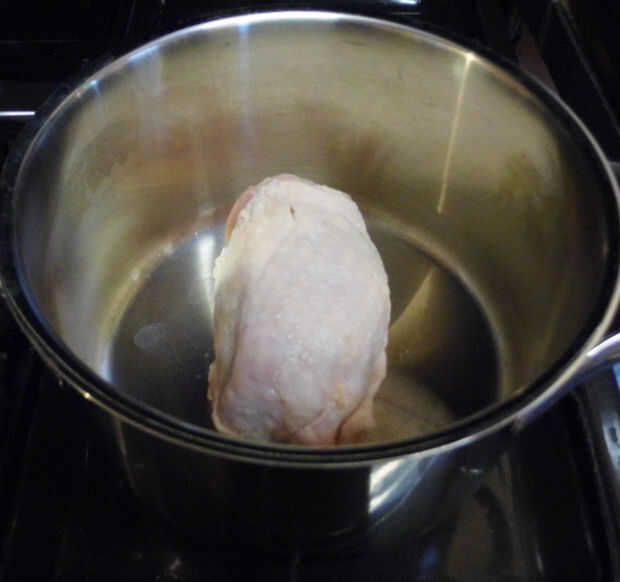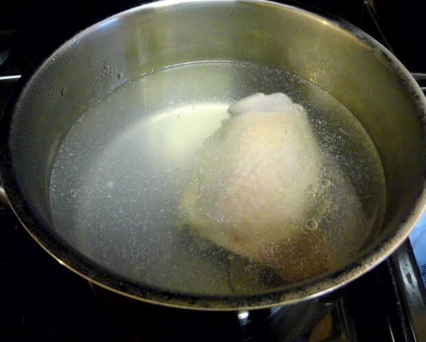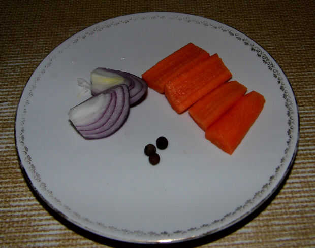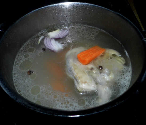 Poner un muslo de pollo en un cazo y vierta agua caliente sobre él (lo suficiente como para cubrir el pollo), añada algunas cebollas y pimienta negra. Cocer a fuego lento sobre una hora o un poco más (hasta que el pollo empieza a desmoronarse). Últimos 10 minutos antes de poner el pollo apagado, añadir las zanahorias a los lingotes y continuar hirviendo.