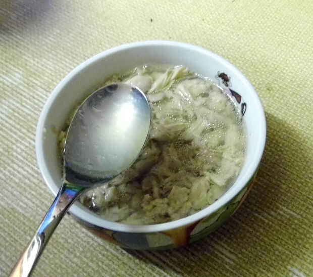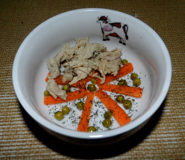 Poner el pollo encima de las zanahorias con mucho cuidado (para que no se conseguirá la forma distorsionada/en mal estado). Poner el pollo en y presione suavemente la cuchara en la parte superior. Ahora empezar a verter el caldo sobre él muy suavemente, llenar el plato hasta la parte superior. (Desechar el resto de los lingotes - o hacer una sopa :-D)