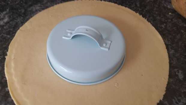 2. Dividir la masa en dos partes iguales. Estirar cada uno en círculos iguales. Lugar un pequeño cuenco o plato en el centro del círculo, he utilizado una tapa de frasco.