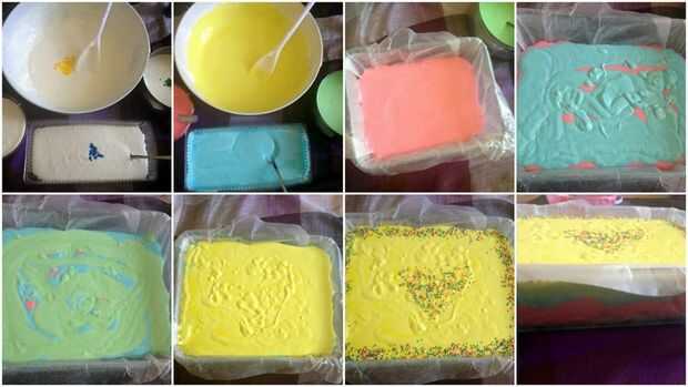 3. Vierta la mezcla de color rosa en la parte inferior, azul en la parte superior el color de rosa, verde en la parte superior el azul y amarillo sobre la mezcla verde. (Si los colores se mezclan con la capa inferior, muy bien.)