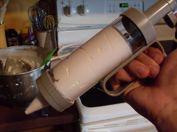 Se puede utilizar cualquier método que como pipa, sucedió que un decorador de postres de Wilson (básicamente una bolsa de plástico tubería con esteroides) que tenía la punta de un pequeño círculo y una punta de estrella. Utiliza la punta del círculo para hacer las estrellas (y se tira de ellas en puntos con un palillo de dientes) y utiliza la punta de estrella para hacer los bordes inferior y superior. El borde inferior es sólo una línea que va alrededor de la base, mientras que el borde superior es un zig-zag, va desde arriba a los lados y la parte superior, en un patrón de zig-zag. Cuando lo hice, usé el resto de la crema batida, betún de antes. Había conseguido realmente suave, por lo que corrió un poco antes de que podía congelarlo. Se dio un patrón caído muy interesante que deseo sinceramente un poco. Sin embargo, recomiendo usar baño de crema para esta parte de la tubería. Establece mejor de batida crema.