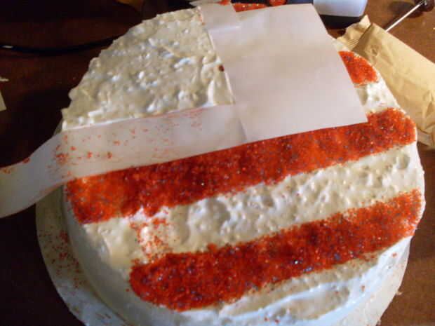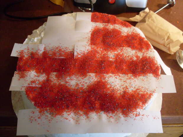 Cortar una esquina de un pedazo de papel de impresora (para hacer la plantilla para la parte azul) y cortar el resto del papel en 3/4 - tiras de 1 pulgada, para las bandas. Simplemente colocar la esquina para que la esquina inferior derecha está cerca del centro (usted puede solo globo ocularlo). La línea de las tiras al lado y debajo de él, asegurándose de que van a los bordes de la torta. Corte algunos trocitos para extender, si es necesario (como hice yo). Ahora sólo Espolvorea el azúcar roja sobre las zonas expuestas y presione un poco para asegurarse de que se adhieren a la cubierta. Retire el papel y admirar su obra hasta el momento.