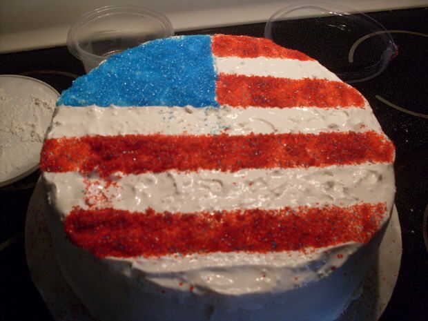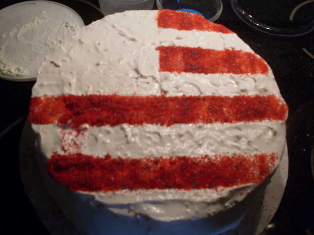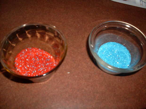 Ahora, la bandera debe ser añadido antes de su congelado, mientras que su suave todavía. Lo que hice fue a cortar un pedazo de papel una plantilla áspera (por falta de una palabra mejor), y utilicé azúcares decorador rojo y azul, un poco menos de un cuarto taza cada uno.