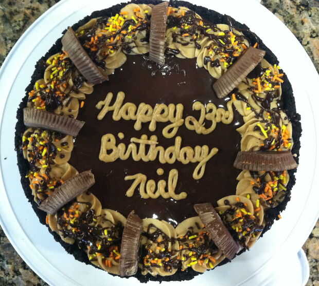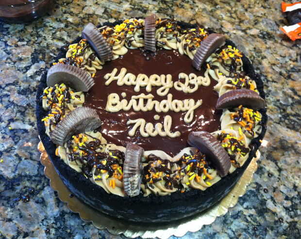 Para decorar: El resto de la mantequilla de cacahuete del frasco en el microondas durante aproximadamente un minuto. Una vez que la mantequilla de maní es una consistencia líquida, mezclar con sobre una taza de cool whip para lograr una consistencia de mousse de crema de cacahuate. Coloque el mousse en bolsa Ziploc. Cortar una esquina de la bolsa a mousse de tubo alrededor de la torta. Reducir el tamaño de bocado Reeses por la mitad, así que tienes 8 piezas y el lugar alrededor de la torta. Salsear mousse extra chocolate fudge y sprinkles y disfruta!