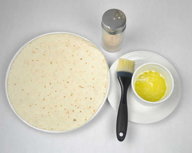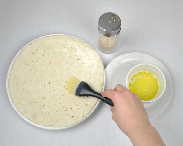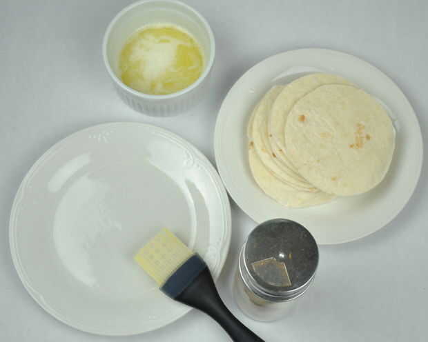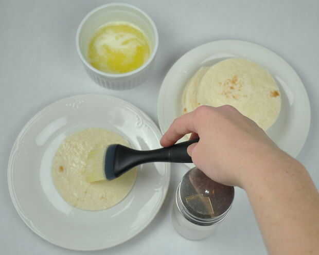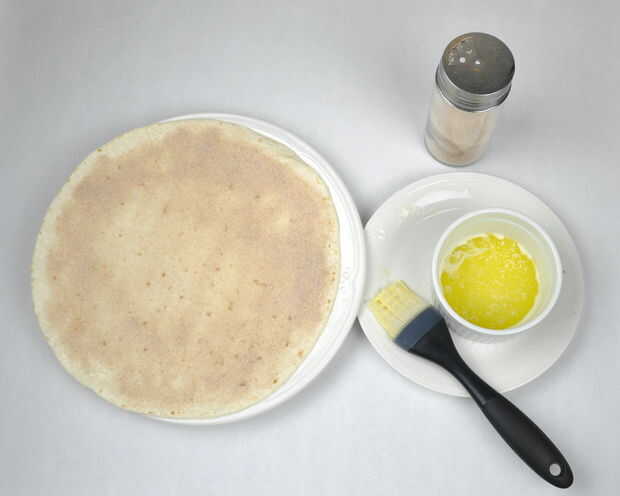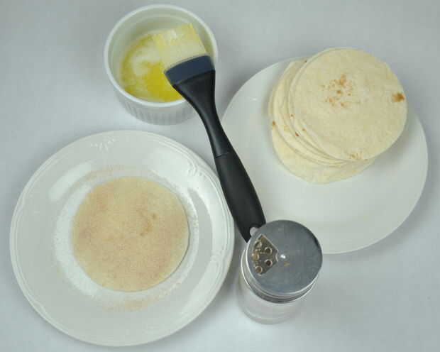 - Conseguir una placa, su tortilla, mantequilla derretida, pincel de repostería y azúcar de canela.