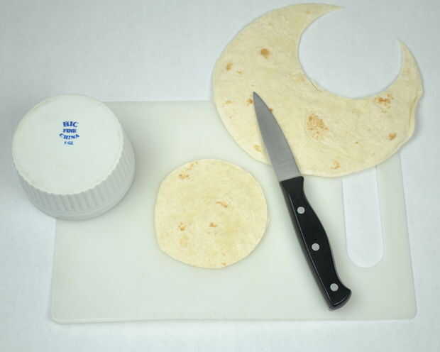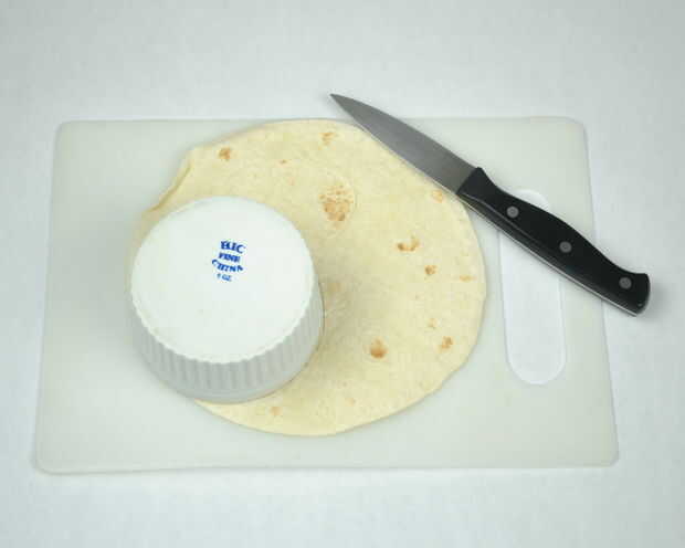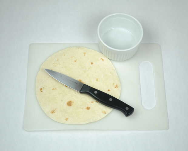 - Tomar la tortilla pequeña, tabla de cortar, cuchillo y molde.