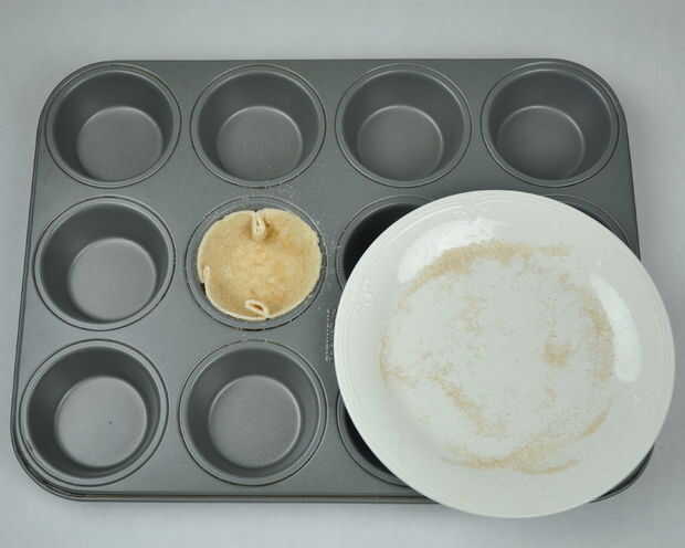 - Poner en la bandeja de la Magdalena, tenga cuidado de no rasgarla. Los lados se doble y volante.