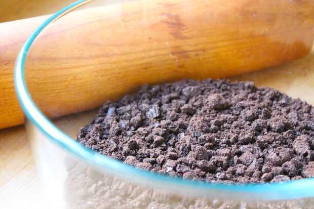 Tomar una fila entera de galletas Oreo y raspe fuera el relleno de crema. Triture por lo que son bastante finos - ponerlos en una bolsa ziploc y utiliza un pin de roling para aplastarlos.