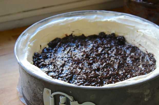 Microondas la salsa de chocolate caliente solo hasta que esté líquida y luego combinar la galletas Oreo y fudge caliente la salsa en un bol. Sacar tu pastel frío de congelador y alisar la capa de mezcla de chocolate en y luego ponerlo en el congelador -, es importante hacer este rápido desde la salsa de chocolate es un poco cálido. :)