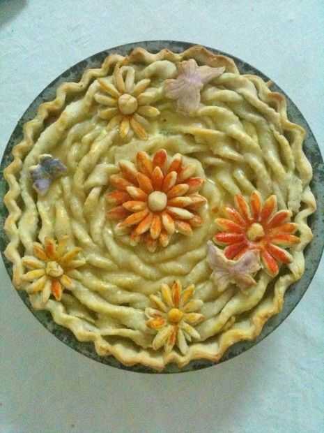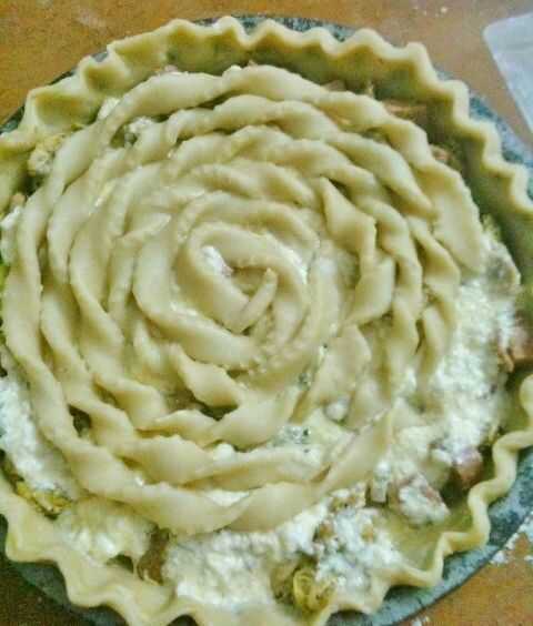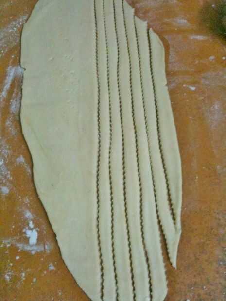 Luego estirar la masa y cortar tiras... suavemente las tiras de elevación y coloque el borde en el centro de la tarta... Gire suavemente e ir en espiral hasta cubrir la parte superior.