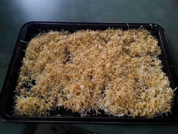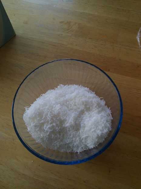 La otra cosa que color era mi coco, he usado para imitar la paja que viene en la caja como material de embalaje. I mezcla de colorante de alimentos color amarillo y marrón en un recipiente con agua y mezcló todo en el coco. Luego poner en una placa para horno y poner en el horno en la posición más baja y deje que se seque hacia fuera. Creo que en la izquierda durante unos 20 minutos y mantuvo control sobre él y removiendo. Hace tomar más o menos tiempo dependiendo de la cantidad de agua que utiliza, pero nuestro objetivo final es sólo tener el coco seco otra vez.