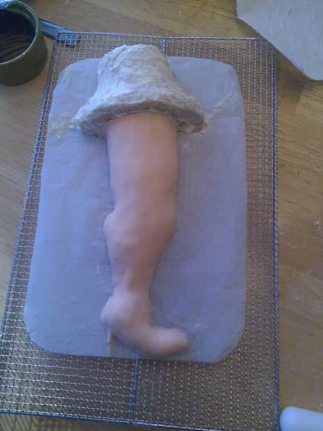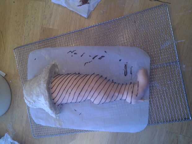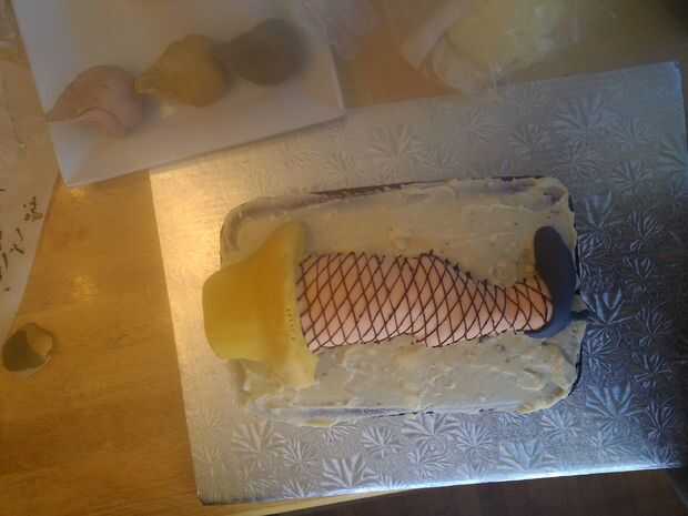 Ahora que la guinda de la pierna es agradable y firme lanzó mi carne fondant de color y ponérselo. Luego utiliza chips de chocolate derretidos e hilo a las medias de red, a partir de una dirección y luego el otro. lo hice porque si me espera hasta el fin de hacer mi fondant y desordenado en los balancines y luego tendría que rehacerlo completamente todo. Puse la pierna en el refrigerador para el chocolate a harded entonces hizo la sombra de Zapata y la lámpara.