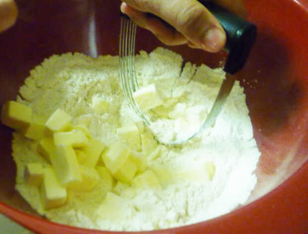 3. mezclar la mantequilla con la harina y con una batidora de repostería mezclar la mantequilla. Esto hará que la harina "prueba del agua"