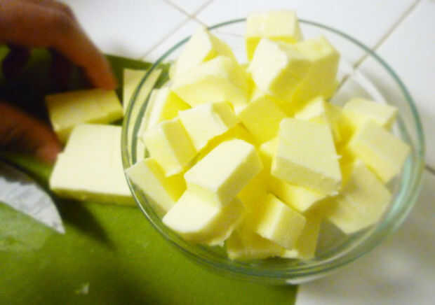 2. cortar los palitos de mantequilla (1/2") ^ 3 cubos, más o menos