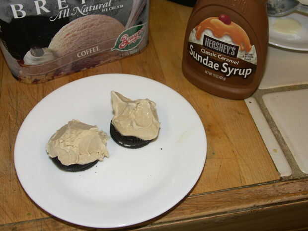 Tomar una cucharada de helado ligeramente ablandada, moldear como la arcilla en un trozo de tamaño apropiado para caber encima de una oreo. Mush en la parte superior de una oreo. Repita para tantos micro-mudpies como estás haciendo.