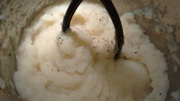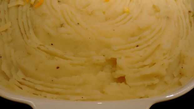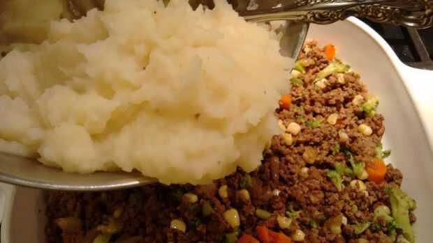 Cuando tienes una agradable cremosidad a tus papas (o uno con grumos, si lo que prefiere) capa sobre la carne, extendiendo uniformemente.
