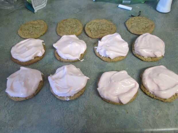 Pegando el malvavisco, colocar 3 galletas para cada pastel de luna.  Vierta una cucharada de malvavisco terminado en 2 de las 3 galletas.  Use un cuchillo de mantequilla para extender el malvavisco uniformemente sobre cada galleta.   Dejar reposar 1/2 hora.