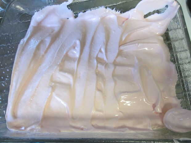 (Si tienes el extra de la melcocha, vierta la izquierda sobre un spray antiadherente, preparado de pan y deje reposar a temperatura ambiente hasta que esté firme, aproximadamente 2 horas. Usando un cuchillo que ha sido sumergido en agua caliente, malvavisco cortado en pedazos, rodillo en azúcar en polvo, sacudiendo el exceso. Almacenar en un recipiente hermético