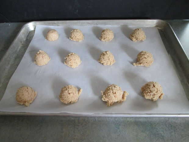 Añadir los ingredientes secos y mezclar bien.  Uso una cuchara para galletas para medir la masa en el papel de pergamino cubierto de hornear, aparte unas 3 pulgadas.  Solía la cucharada de galleta en un intento de hacer las galletas uniformes en tamaño y forma.