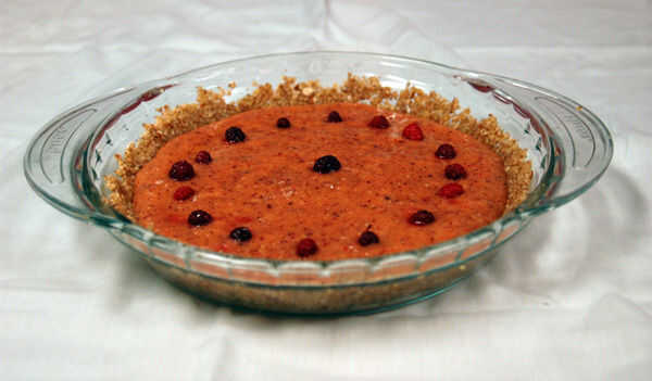 Vierta la mezcla en la tarta. Si lo desea, decorar con frambuesas. Mis bayas fueron los salvajes que tomé el verano pasado, que pensé que era un buen toque DIY.