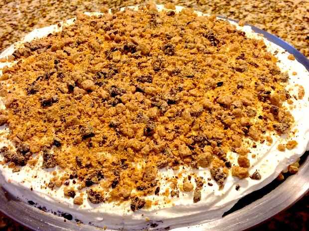 tiempo de preparación: 10 minutosRefrigerador tiempo: 30 minutosIngredientes:1/2 taza de mantequilla de maní cremosaenvase de 1-8oz de crema batidacorteza de galletas de chocolate de 1 gramoOpcional; * Chocolate jarabePaso 1: 3 ingredientes pastel de