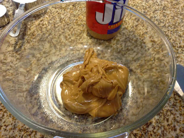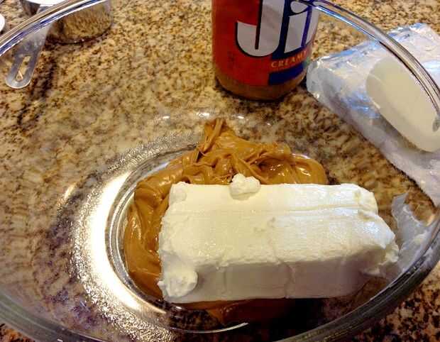 En un tazón agregue la mantequilla de maní y paquete de queso crema ablandado.