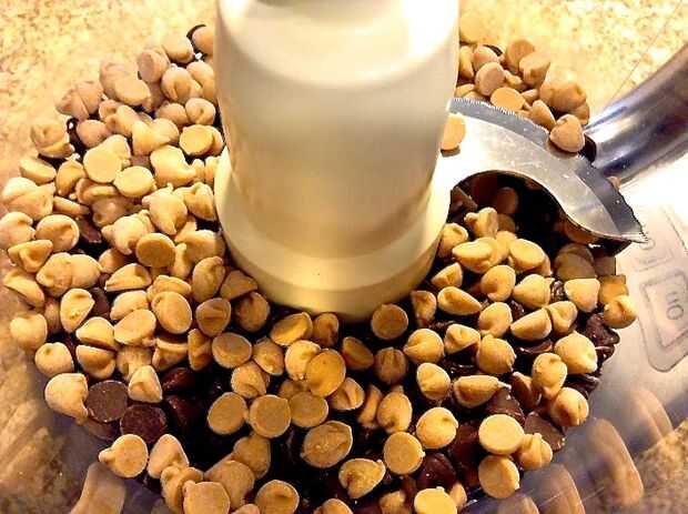 En un procesador de alimentos combinar y pulso a 1/2 taza de chocolate chips y chips de mantequilla de maní 1/2 taza, que se asemeja a las migas gruesas.