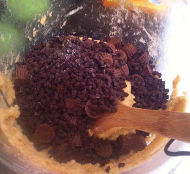 4. Finalmente agregar los chips de chocolate y los minis de Reese.