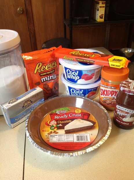 1) 1 taza de mantequilla de maní y 2 cucharadas 2) 12 onzas de cool whip y 3 tazas de relleno 3) 1 paquete de queso crema 4) 1/2 taza de vaso de azúcar 5) 1 de hot fudge topping 6) 1 paquete de taza de mantequilla de cacahuete de Reese 7) 1 preparado de tarta chocolate