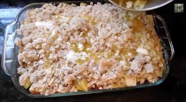 Transferir las manzanas recubiertas en una fuente para hornear grande. Cuidadosamente la cobertura sobre las manzanas cubriendo toda la superficie de la pila. Asegúrese de no acariciar el relleno demasiado. Luego, rocía la mantequilla derretida sobre el zapatero y colóquelo en una bandeja de hojas para hornear a 350 grados durante 45-50 minutos.