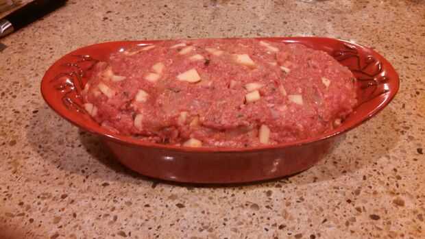 Poner en una cacerola y formar en una forma de buen pan. Decorar la parte superior con algunos trozos de manzana picada en la carne. Se puede utilizar una sartén plana de brownie o un molde de pan más profunda (como la que usé). Se cocinan más rápido y más uniformemente en la bandeja de brownie, y cada pieza tiene un montón de "corteza". Pero el pan más profundo tiene esa forma de pastel de carne tradicional, y este es mi pan más fotogénica, así que lo estoy usando en esta ocasión.