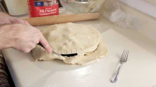 A continuación sellamos los bordes. Hay una variedad de maneras de hacer esto, una forma sencilla es usar la horquilla y simplemente presione hacia abajo alrededor de los bordes. Luego tomar un cuchillo y corte la parte traslapada. No tirar los recortes. Puede usar esto para hacer una mini tarta. :)