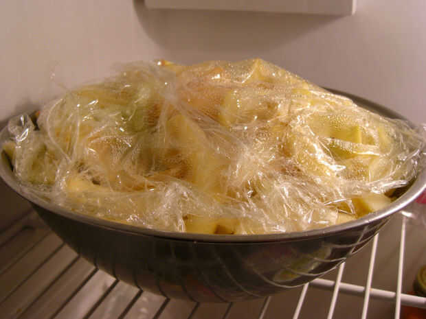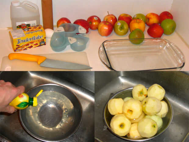 Antes de pelar, coloque un recipiente grande de agua fría y jugo de limón en el fregadero. Este tazón de fuente se mantenga nuestras manzanas y evitar que gire marrón mientras que se están preparando.