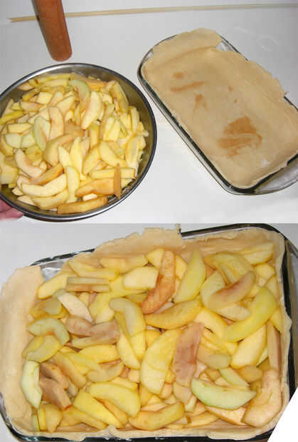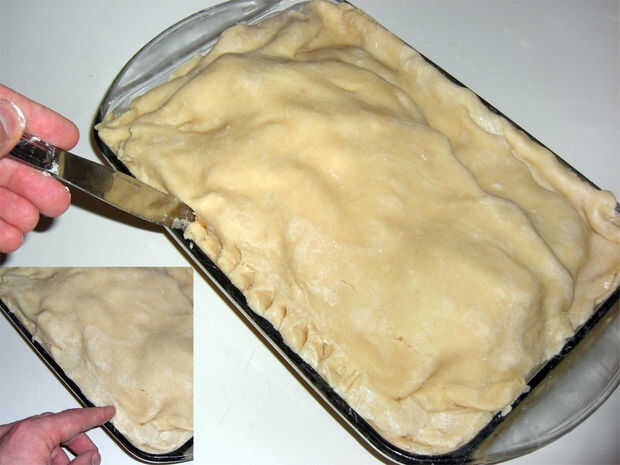 Una vez que se rellena el pastel es hora de añadir la corteza superior. Con los dedos húmedos, lubrique todo el perímetro de la tarta inferior, esto ayudará Únete las cortezas superiores e inferiores crudas. Usando el mismo truco como antes, el rodillo la masa de la corteza superior en el rodillo y en el plato de pastel. Luego, suavemente presione los bordes de la corteza en su lugar y terminar con una navaja para darle un aspecto decorativo.