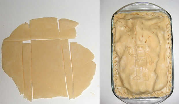 Tenía masa extra que queda de mis ajustes, así que rodé los recortes plano y cortar un pequeño robot. Mojar la parte posterior de los recortes de masa pegado mis formas de robot en la parte superior del pie y luego cortar en algunos agujeros de ventilación en el robot (que representa a las ondas cerebrales de andriod, o algo).