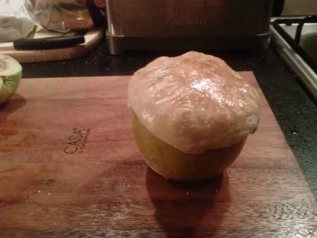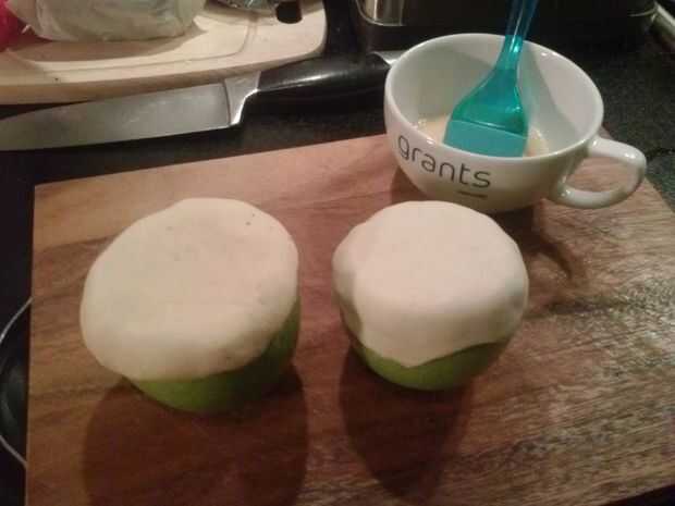 Sólo pack la manzana con el relleno, rollo algunos pastel de hojaldre para hacer un gorro para la manzana (aprox. 3mm de espesor). Cubra el hojaldre con eggwash (sólo bate un huevo hacia arriba).