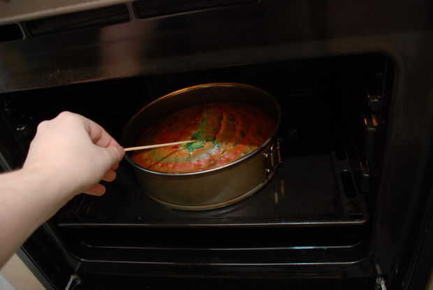 Si no hay masa esté sobre la brocheta después de tomar hacia fuera, se acaba el pastel. Usted todavía podría dejarlo durante 3-5 minutos más estar seguro.