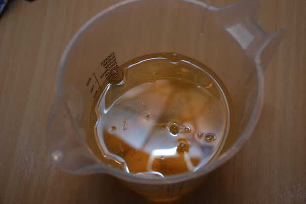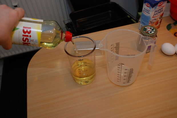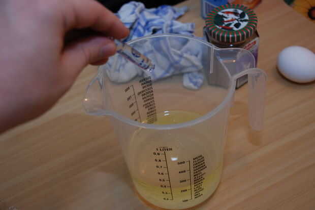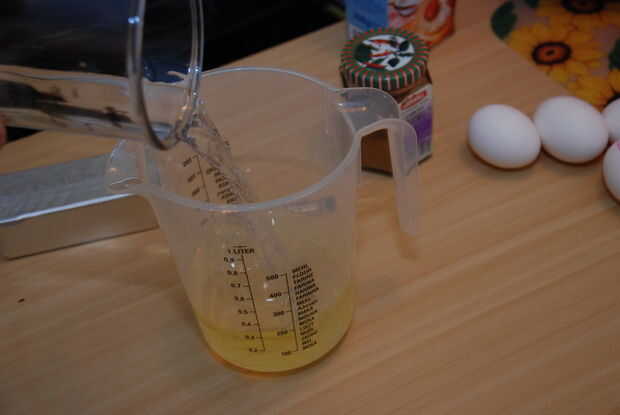 El aceite y el agua van en la jarra, y usted apenas agrega los 5 huevos.