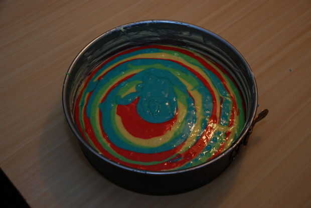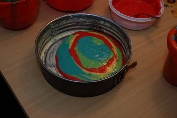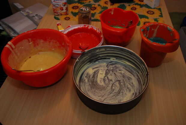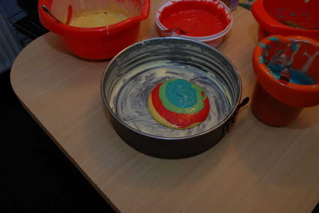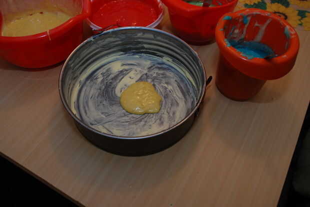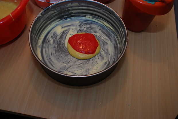 Ahora añadir 1 cuchara de un solo color en el centro de la cacerola.