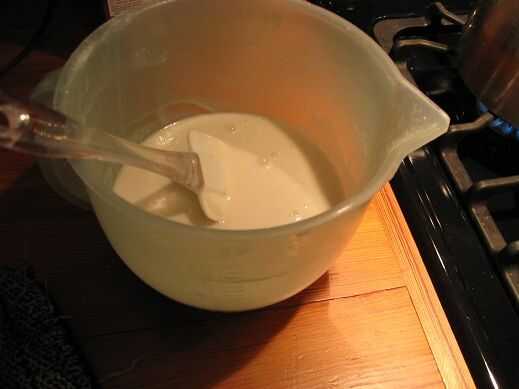 Poner la harina y el azúcar en un tazón. Agregar la mitad de la leche y revolver en una pasta, quitar todos los grumos. Agregar el resto de la leche y revolver bien.