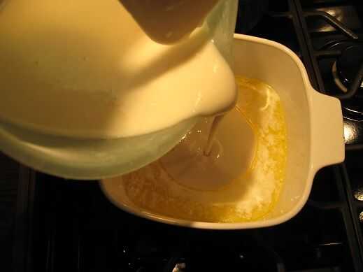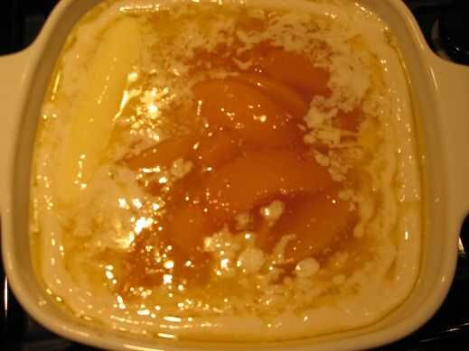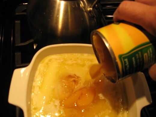 Cuando la mantequilla se haya derretido y la temperatura del horno ha llegado a 350°, vierta la mezcla de harina/azúcar/leche sobre la mantequilla derretida. Con cuidado agregue los melocotones en rodajas, incluyendo el jugo, a la parte superior de la mezcla. Los melocotones comenzarán a instalarse, pero no remover.